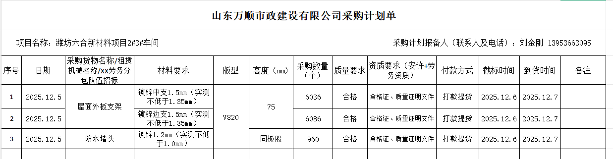 | 屋面外板支架 | 镀锌中支1.5mm(实测不低于1.35mm),V820,高度75mm | 个 | 6036.0 | 是 | 2025-12-07 07:00:00 | |